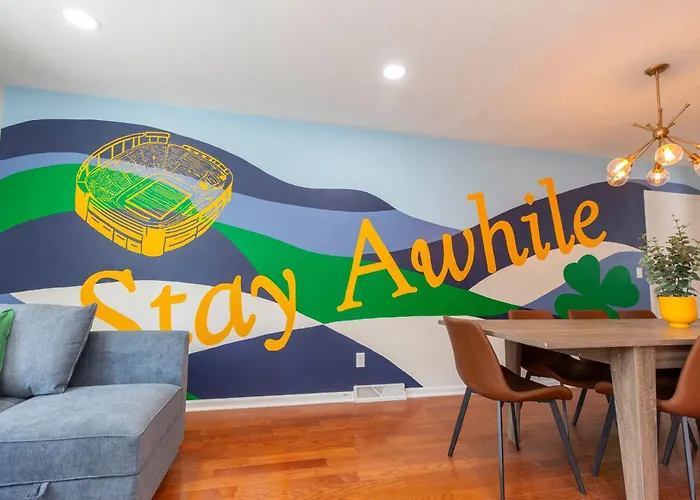 Providing active guests with access to a golf course, the 2-bedroom Game Room Hot Tub Fire Pit 2 Miles To Nd South Bend villa is about 10 minutes' drive from such sports attractions as Frank Eck Stadium. Located 3.4 km from the Notre Dame Golden Dome, this South Bend holiday home provides Wi-Fi and a private parking lot.